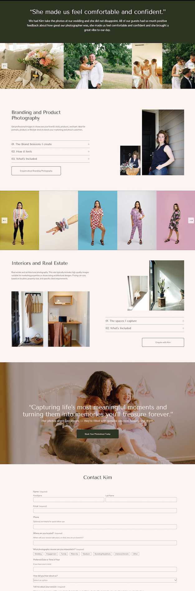 We reorganised her services, refreshed the design, elevated her brand styling, and brought her strongest imagery to the forefront. Her website now feels polished, professional, and reflective of the warmth and quality of her photography — all without her needing to put more on her already full plate.